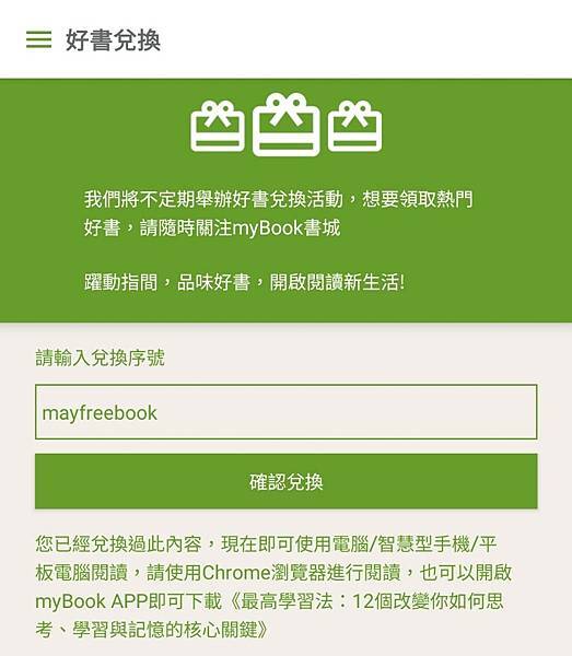 或是下載mybook app, 直接在好書兌換區輸入兌換序號就好.